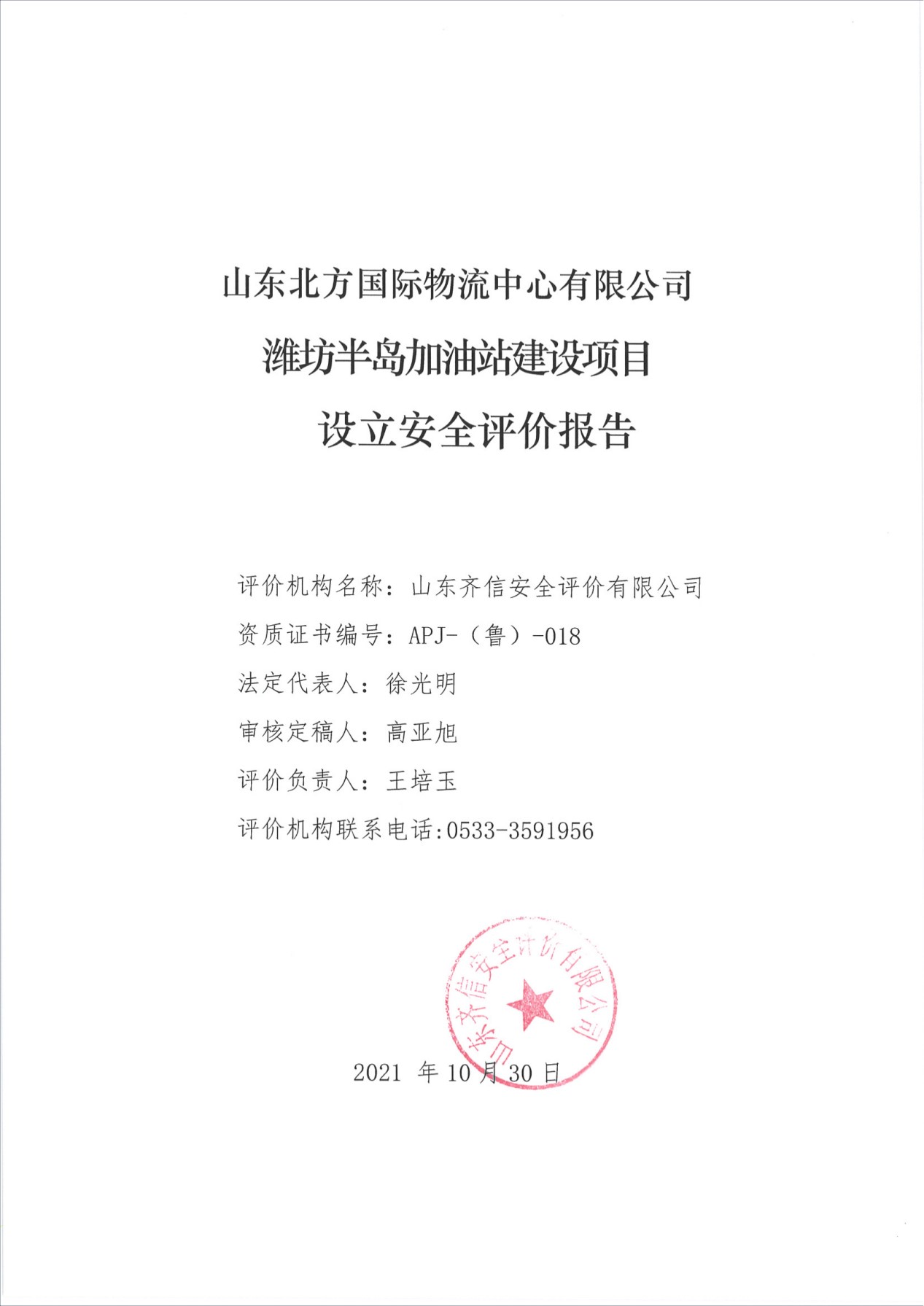 山東北方國際物流中心有限公司位于濰坊市坊子區(qū)翠坊街172號(hào)北方國際物流三區(qū)2號(hào),成立于2008年11月07日,法定代表人滕玉云,注冊資本3000萬元整,經(jīng)營范圍為:倉儲(chǔ)服務(wù)(不食危險(xiǎn)品);普通貨物運(yùn)輸;裝卸服務(wù);信息系統(tǒng)集成開發(fā)與銷售;停車場管理:會(huì)議服務(wù);企業(yè)管理咨詢:物流信息咨詢服務(wù);房地產(chǎn)開發(fā)、銷售、租賃;物業(yè)管理:鋼材剪切:銷售;鋼材、建材、五谷交電、機(jī)電產(chǎn)品:藍(lán)通機(jī)械加工。(依法須經(jīng)批準(zhǔn)的項(xiàng)目,經(jīng)相關(guān)部門批準(zhǔn)后方可開展經(jīng)營活動(dòng)) 山東北方國際物流中心有限公司擬建設(shè)山東北方國際物流中心有限公司濰坊半島加油站建設(shè)項(xiàng)目,并與2021年8月24日取得了該建設(shè)項(xiàng)目備案證明。該建設(shè)項(xiàng)目位于濰坊市坊子區(qū)濰安路與翠坊街交叉口西北方國際物流園內(nèi)。該加油站定員5人,其中安全管理人員1人。2021年6月4日,該站網(wǎng)點(diǎn)規(guī)劃經(jīng)濰坊市商務(wù)局確認(rèn)同意新建濰坊市半島石化加油站有限公司(濰商務(wù)字[2021]10號(hào));2021年9月29日,該站網(wǎng)點(diǎn)規(guī)劃經(jīng)濰坊市商務(wù)局確認(rèn)同意經(jīng)濰商務(wù)字[2021]10號(hào)批復(fù)新建的濰坊市半島石化加油站有限公司變更為山東北方國際物流中心有限公司濰坊半島加油站。 山東北方國際物流中心有限公司濰坊半島加油站總占地面積為3756.95m2,該站總投資為800萬元,該站由山東北方國際物流中心有限公司出資建設(shè)。建設(shè)內(nèi)容包括新建站房1座,加油罩棚1座,汽油加油機(jī)(四槍)2臺(tái),柴油加油機(jī)(三槍)4臺(tái),直埋地下臥式雙層儲(chǔ)油罐6個(gè),其中,汽油罐2臺(tái),單罐容積30立方米;柴油罐4臺(tái),單罐容積50立方米3臺(tái),30立方米1臺(tái),總?cè)莘e150立方米(柴油折半計(jì)入)。建設(shè)加油道10條,砼水泥預(yù)制地面 3367平方米。 |