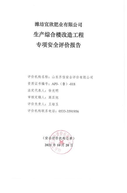 濰坊宜欣肥業(yè)有限公司于2011年8月4日經(jīng)昌樂(lè)縣工商行政管理局注冊(cè)成立,公司注冊(cè)資本206萬(wàn)元,注冊(cè)地址為昌樂(lè)縣五圖街道項(xiàng)目區(qū)路南側(cè)、東村路東側(cè),公司法人代表為甄慶梅,2015年12月11日由昌樂(lè)縣市場(chǎng)監(jiān)督管理局核發(fā)新的營(yíng)業(yè)執(zhí)照。該公司經(jīng)營(yíng)范圍為:復(fù)合肥生產(chǎn)、銷(xiāo)售;氮肥、磷肥、鉀肥、有機(jī)肥、微生物肥銷(xiāo)售。該公司現(xiàn)有職工30人,其中技術(shù)管理人員1人,專(zhuān)職安全管理人員1人。 濰坊宜欣肥業(yè)有限公司根據(jù)本公司實(shí)際情況,將原配件庫(kù)更改使用性質(zhì),作為生產(chǎn)綜合樓使用。本次生產(chǎn)綜合樓改造項(xiàng)目?jī)H將原有配件庫(kù)更改為生產(chǎn)綜合樓,不涉及投資。 |