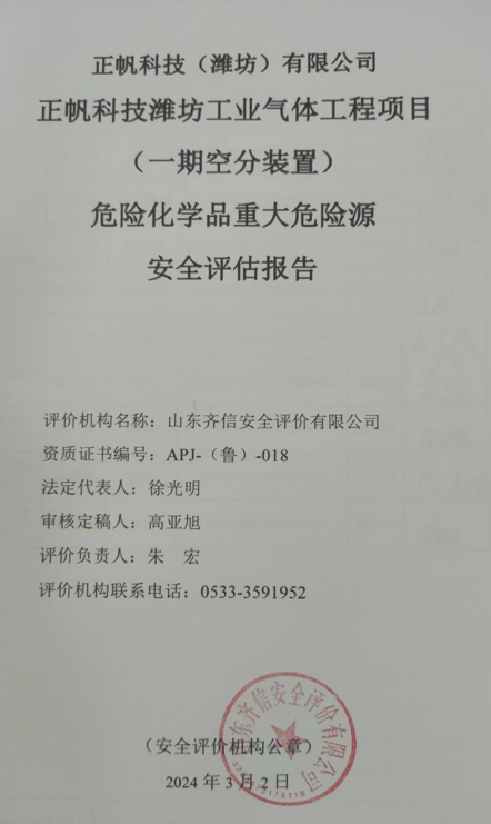 正帆科技(濰坊)有限公司成立于2021年06月03日,企業(yè)類型為有限責(zé)任公司(港澳臺(tái)投資、非獨(dú)資),注冊(cè)地位于濰坊濱海經(jīng)濟(jì)技術(shù)開發(fā)區(qū)大家洼街道黃海路以西、規(guī)劃支路以南,法定代表人為史可成,注冊(cè)資本2000萬美元,經(jīng)營范圍包括一般項(xiàng)目:工程和技術(shù)研究和試驗(yàn)發(fā)展;基礎(chǔ)化學(xué)原料制造(不含危險(xiǎn)化學(xué)品等許可類化學(xué)品的制造);特種設(shè)備出租;機(jī)械設(shè)備租賃;陸地管道運(yùn)輸;氣體、液體分離及純凈設(shè)備銷售;電子專用材料制造;電子專用材料銷售;儀器儀表銷售;半導(dǎo)體器件專用設(shè)備銷售;機(jī)械電氣設(shè)備銷售;光伏設(shè)備及元器件銷售;電子產(chǎn)品銷售;技術(shù)服務(wù)、技術(shù)開發(fā)、技術(shù)咨詢、技術(shù)交流、技術(shù)轉(zhuǎn)讓、技術(shù)推廣。(除依法須經(jīng)批準(zhǔn)的項(xiàng)目外,憑營業(yè)執(zhí)照依法自主開展經(jīng)營活動(dòng))許可項(xiàng)目:道路貨物運(yùn)輸(含危險(xiǎn)貨物);水路危險(xiǎn)貨物運(yùn)輸;移動(dòng)式壓力容器/氣瓶充裝;藥品批發(fā);藥品零售。(依法須經(jīng)批準(zhǔn)的項(xiàng)目,經(jīng)相關(guān)部門批準(zhǔn)后方可開展經(jīng)營活動(dòng),具體經(jīng)營項(xiàng)目以相關(guān)部門批準(zhǔn)文件或許可證件為準(zhǔn))。 為增加公司的業(yè)務(wù)輻射范圍,與公司現(xiàn)有產(chǎn)品產(chǎn)生協(xié)同效應(yīng),提高公司市場(chǎng)競(jìng)爭(zhēng)優(yōu)勢(shì),上海正帆科技股份有限公司計(jì)劃由全資子公司上海徠風(fēng)工業(yè)科技有限公司與香港正帆國際貿(mào)易有限公司共同出資新設(shè)全資孫公司正帆科技(濰坊)有限公司,在濰坊濱海經(jīng)濟(jì)技術(shù)開發(fā)區(qū)實(shí)施正帆科技濰坊工業(yè)氣體工程項(xiàng)目。項(xiàng)目分二期建設(shè),一期為生產(chǎn)氧氮?dú)宓目諝夥蛛x裝置,二期工程為單氮空分及鋼瓶充裝生產(chǎn)線。一期項(xiàng)目于2023年4月開工建設(shè),于2024年2月建設(shè)完成。 為貫徹執(zhí)行《中華人民共和國安全生產(chǎn)法》、《危險(xiǎn)化學(xué)品安全管理?xiàng)l例》和《危險(xiǎn)化學(xué)品重大危險(xiǎn)源監(jiān)督管理暫行規(guī)定》(國家安監(jiān)總局令第40號(hào),依據(jù)第79號(hào)修正)的相關(guān)要求,正帆科技(濰坊)有限公司委托山東齊信安全評(píng)價(jià)有限公司對(duì)正帆科技(濰坊)有限公司正帆科技濰坊工業(yè)氣體工程項(xiàng)目(一期空分裝置)進(jìn)行危險(xiǎn)化學(xué)品重大危險(xiǎn)源安全評(píng)估。 山東齊信安全評(píng)價(jià)有限公司評(píng)價(jià)人員依據(jù)相關(guān)的安全生產(chǎn)法律、法規(guī)、標(biāo)準(zhǔn)、條例和規(guī)范,在對(duì)該公司廠區(qū)仔細(xì)分析、認(rèn)真考察的基礎(chǔ)上,采用適當(dāng)?shù)脑u(píng)價(jià)方法,對(duì)該公司危險(xiǎn)化學(xué)品重大危險(xiǎn)源作出科學(xué)的評(píng)價(jià)和分析,并編制完成了該公司的危險(xiǎn)化學(xué)品重大危險(xiǎn)源安全評(píng)估報(bào)告。 |