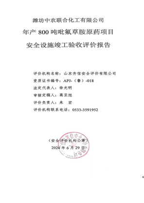 濰坊中農(nóng)聯(lián)合化工有限公司成立于2006年10月27日,注冊(cè)資本12740萬元,為有限責(zé)任公司(自然人投資或控股的法人獨(dú)資),法定代表人苑文強(qiáng),位于濰坊濱海經(jīng)濟(jì)開發(fā)區(qū)臨港化工園內(nèi),總占地面積162畝。 濰坊中農(nóng)聯(lián)合化工有限公司是國家定點(diǎn)農(nóng)藥生產(chǎn)企業(yè),屬于山東中農(nóng)聯(lián)合生物科技股份有限公司的全資子公司。山東中農(nóng)聯(lián)合生物科技股份有限公司是中國農(nóng)資集團(tuán)投資控股企業(yè),以生物農(nóng)藥、中間體及精細(xì)化工產(chǎn)品的生產(chǎn)和銷售為主營業(yè)務(wù)。 濰坊中農(nóng)聯(lián)合化工有限公司投資建設(shè)了年產(chǎn)800噸吡氟草胺項(xiàng)目(以下稱該項(xiàng)目)。該項(xiàng)目于2021年9月1日取得山東省建設(shè)項(xiàng)目備案證明,項(xiàng)目代碼:2109-370772-04-01-321521。該項(xiàng)目由山東奧薩斯安全咨詢?cè)u(píng)價(jià)有限公司編制了設(shè)立安全評(píng)價(jià)報(bào)告,于2022年6月13日濰坊市應(yīng)急管理局出具了危險(xiǎn)化學(xué)品建設(shè)項(xiàng)目安全審查意見書,編號(hào):濰應(yīng)急?;?xiàng)目審字[2022]0044號(hào);由山東天浩工程設(shè)計(jì)有限公司編制了安全設(shè)施設(shè)計(jì)專篇并出具了施工圖,2023年4月4日濰坊市應(yīng)急管理局出具了危險(xiǎn)化學(xué)品建設(shè)項(xiàng)目安全審查意見書,編號(hào):濰應(yīng)急?;?xiàng)目審字[2023]0022號(hào)。該項(xiàng)目施工單位為江蘇威達(dá)建設(shè)集團(tuán)有限公司,監(jiān)理單位為濟(jì)南石油化工設(shè)計(jì)院。該項(xiàng)目于2023年4月開工建設(shè),2023年9月竣工。項(xiàng)目建設(shè)完成后由設(shè)計(jì)單位、施工單位、監(jiān)理單位、建設(shè)單位簽署了建設(shè)工程交工驗(yàn)收?qǐng)?bào)告。企業(yè)在試生產(chǎn)前組織廠內(nèi)相關(guān)人員編制了試生產(chǎn)方案,并委托山東奧薩斯安全咨詢?cè)u(píng)價(jià)有限公司編制了試生產(chǎn)條件安全評(píng)價(jià)報(bào)告,聘請(qǐng)專家對(duì)試生產(chǎn)方案進(jìn)行了評(píng)審、對(duì)試生產(chǎn)條件進(jìn)行了確認(rèn),對(duì)專家提出的意見進(jìn)行了整改。 該項(xiàng)目為新建項(xiàng)目,產(chǎn)品為吡氟草胺,副產(chǎn)品為31%鹽酸、亞硫酸鈉,其中副產(chǎn)品31%鹽酸于危險(xiǎn)化學(xué)品,因此該項(xiàng)目屬于危險(xiǎn)化學(xué)品生產(chǎn)建設(shè)項(xiàng)目。 根據(jù)《中華人民共和國安全生產(chǎn)法》、《危險(xiǎn)化學(xué)品安全管理?xiàng)l例》、《山東省安全生產(chǎn)條例》、《危險(xiǎn)化學(xué)品建設(shè)項(xiàng)目安全監(jiān)督管理辦法》等法律法規(guī)要求,該項(xiàng)目建設(shè)完成后應(yīng)進(jìn)行安全設(shè)施竣工驗(yàn)收評(píng)價(jià)。 受濰坊中農(nóng)聯(lián)合化工有限公司委托,山東齊信安全評(píng)價(jià)有限公司承擔(dān)了該項(xiàng)目的安全設(shè)施竣工驗(yàn)收評(píng)價(jià)。雙方簽訂《安全評(píng)價(jià)技術(shù)服務(wù)合同》后,山東齊信安全評(píng)價(jià)有限公司確定項(xiàng)目負(fù)責(zé)人,成立評(píng)價(jià)項(xiàng)目組,根據(jù)國家有關(guān)安全生產(chǎn)法律法規(guī)、行政規(guī)章及標(biāo)準(zhǔn)規(guī)范要求,通過對(duì)企業(yè)提供的資料進(jìn)行分析和現(xiàn)場(chǎng)檢查,結(jié)合其生產(chǎn)的實(shí)際情況,運(yùn)用科學(xué)的評(píng)價(jià)方法進(jìn)行定性、定量分析,提出合理、可行的安全對(duì)策措施及建議,并按照《安全驗(yàn)收評(píng)價(jià)導(dǎo)則》(AQ8003-2007)、《危險(xiǎn)化學(xué)品建設(shè)項(xiàng)目安全評(píng)價(jià)細(xì)則(試行)》(安監(jiān)總?;?/span>[2007]255號(hào))和有關(guān)法規(guī)、技術(shù)標(biāo)準(zhǔn)、文件的規(guī)定與要求編制完成了本評(píng)價(jià)報(bào)告。濰坊中農(nóng)聯(lián)合化工有限公司應(yīng)對(duì)提供資料的真實(shí)性負(fù)全部責(zé)任。 |